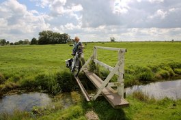 Aan de overzijde loopt u door het land via de witte slootbruggen naar de kleine asfaltweg die u na 500 m bereikt.
